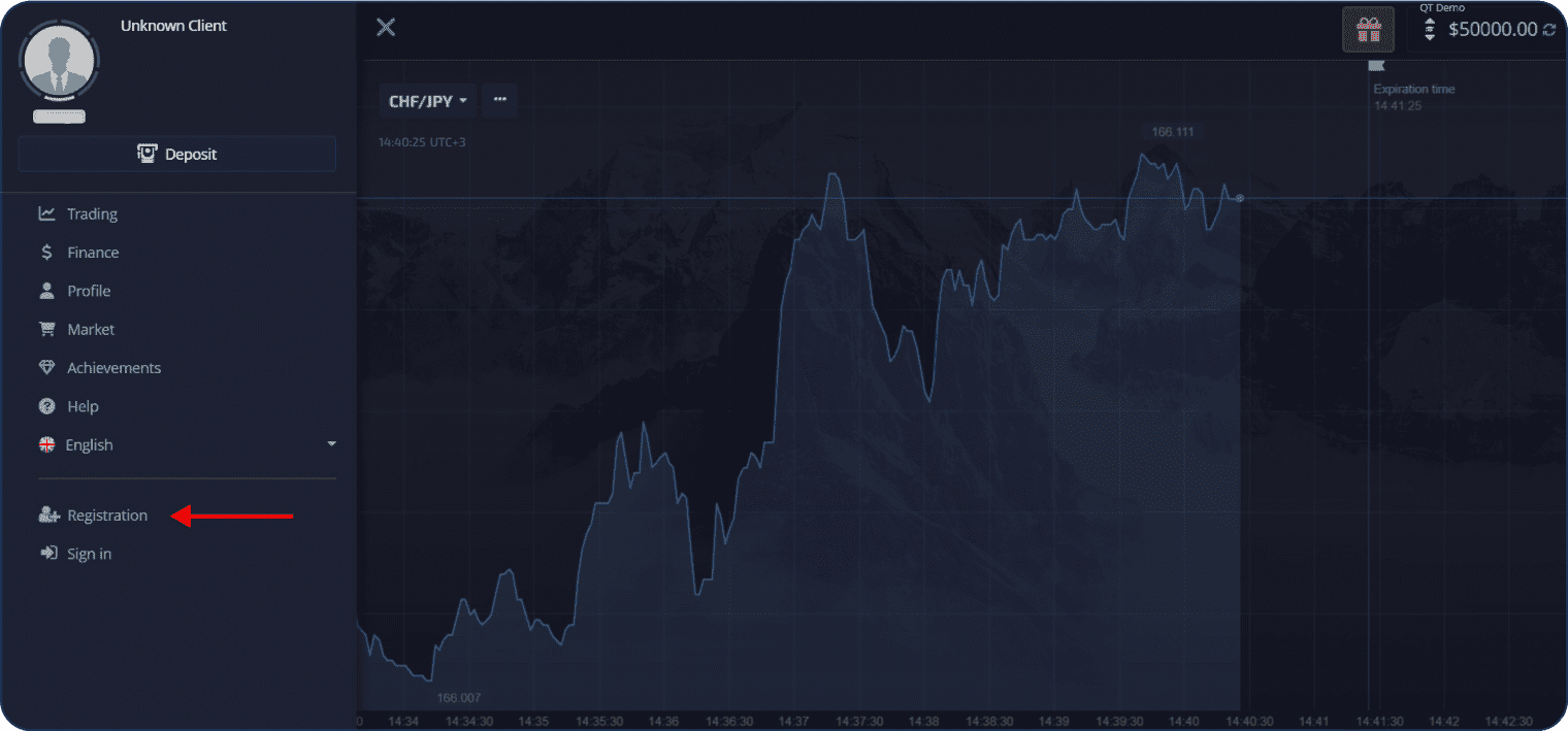 Clique em "Registro" para criar uma nova conta no PocketOption.